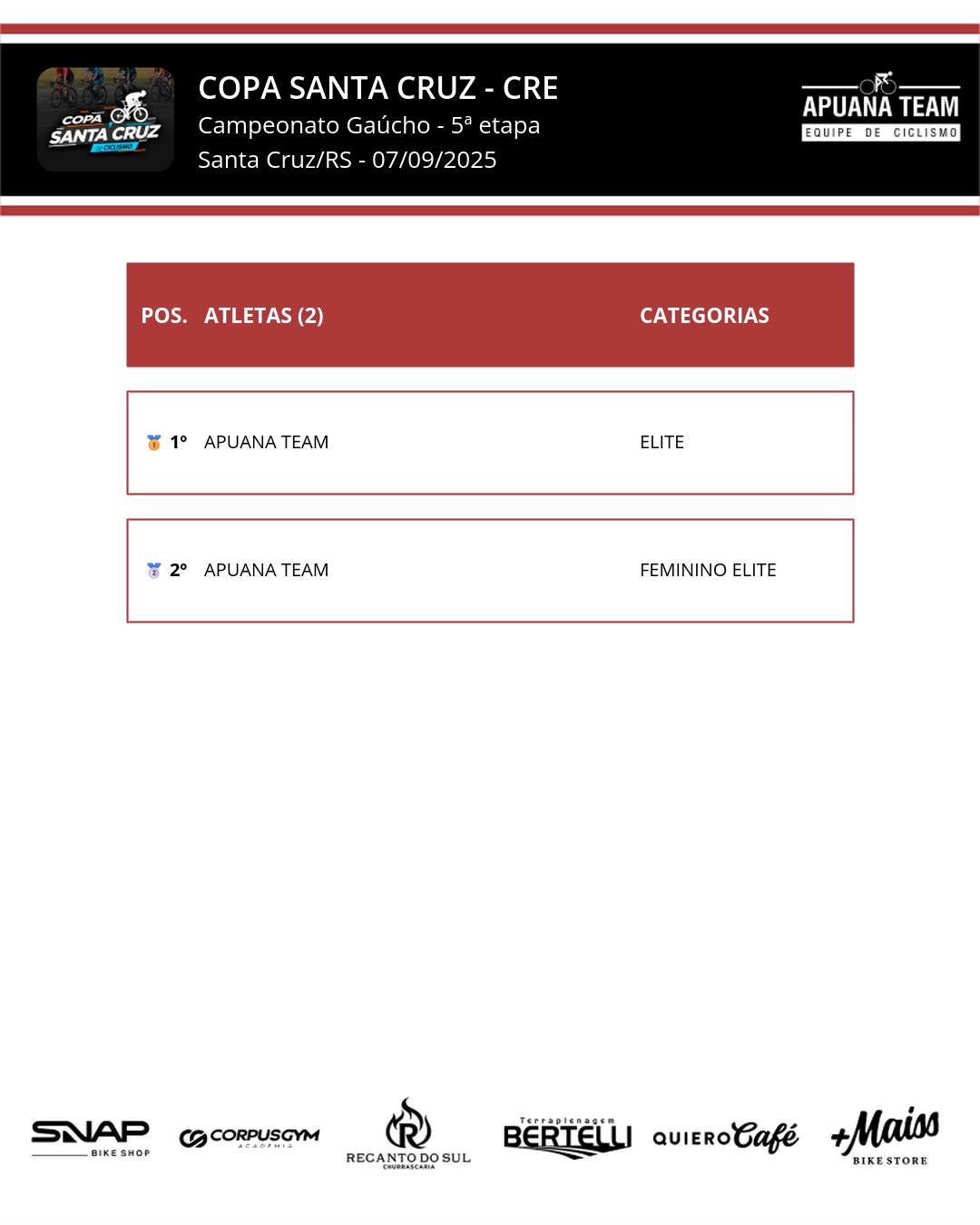 | 🥈 | 2 | APUANA TEAM | FEMININO ELITE |